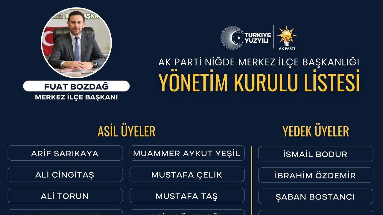 "Türkiye Yüzyılı" vizyonu doğrultusunda çalışmalarını hızlandıran Niğde Merkez İlçe Başkanlığı, Fuat Bozdağ başkanlığındaki yeni yönetim kurulu listesini resmen açıkladı.