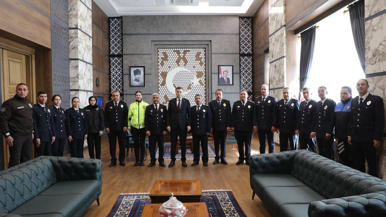 10 Nisan Polis Günü ve Polis Haftası kapsamında, İl Emniyet Müdürü Erdinç Yüceer, Polis Meslek Eğitim Merkezi Müdürü Mehmet Kemal Arısoy ve beraberindeki emniyet personeli, Vali Nedim Akmeşe’yi makamında ziyaret etti.