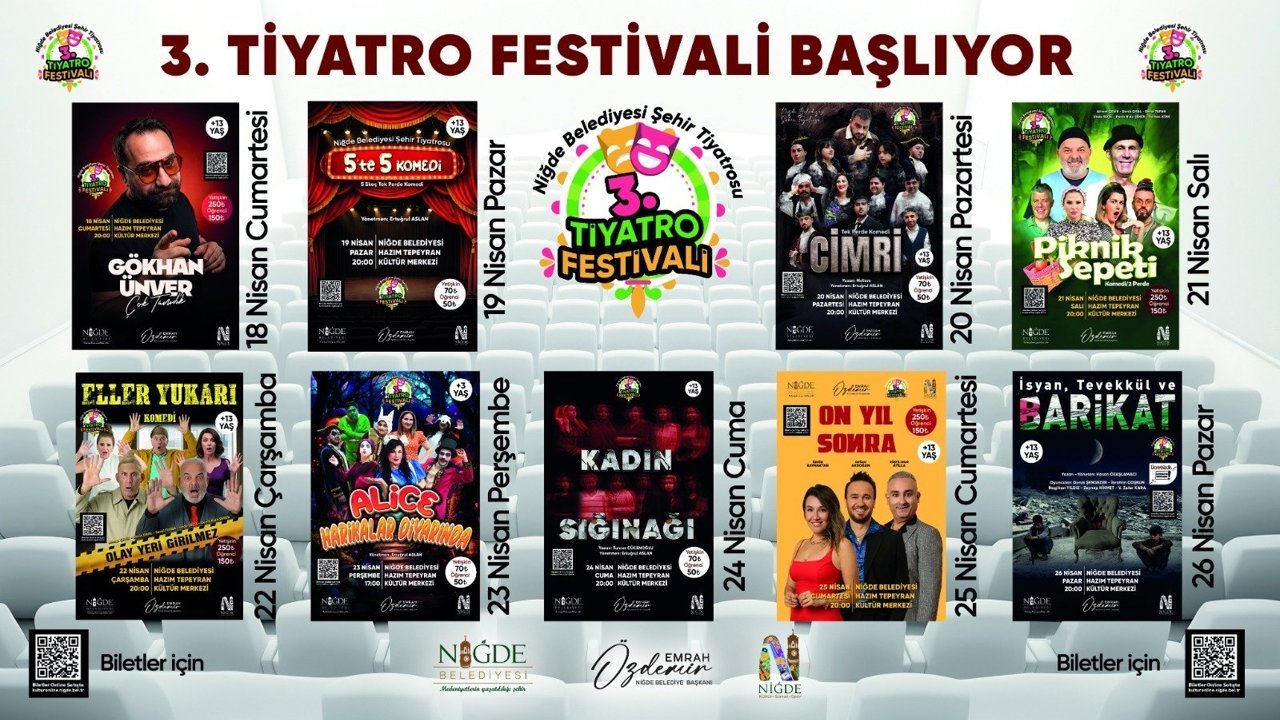 18 Nisan Cumartesi günü Gökhan Ünver’in sevilen gösterisi “Çok Tanıdık” ile perdelerini açacak olan 3. Tiyatro Festivali'nin programı şu şekilde: 18 Nisan Cumartesi: Gökhan Ünver- Çok Tanıdık Saat 20:00, 19 Nisan Pazar: 5'te 5 Komedi Saat 20:00, 20 Nisan Pazartesi: Cimri Saat 20:00, 21 Nisan Salı: Piknik Sepeti Saat 20:00, 22 Nisan Çarşamba: Eller Yukarı Saat 20:00, 23 Nisan Perşembe: Alice Harikalar Diyarında Saat 17:00, 24 Nisan Cuma: Kadın Sığınağı Saat 20:00, 25 Nisan Cumartesi: On Yıl Sonra Saat 20:00, 26 Nisan Pazar: İsyan, Tevekkül ve Barikat Saat 20:00. Festival biletleri, Niğde Belediyesi'nin çevrimiçi bilet satış platformu olan kulturonline.nigde.bel.tr adresi üzerinden temin edilebilecek. Tüm oyunlar (çocuk oyunu hariç) saat 20:00'de Hazım Tepeyran Kültür Merkezi'nde sahnelenecek.