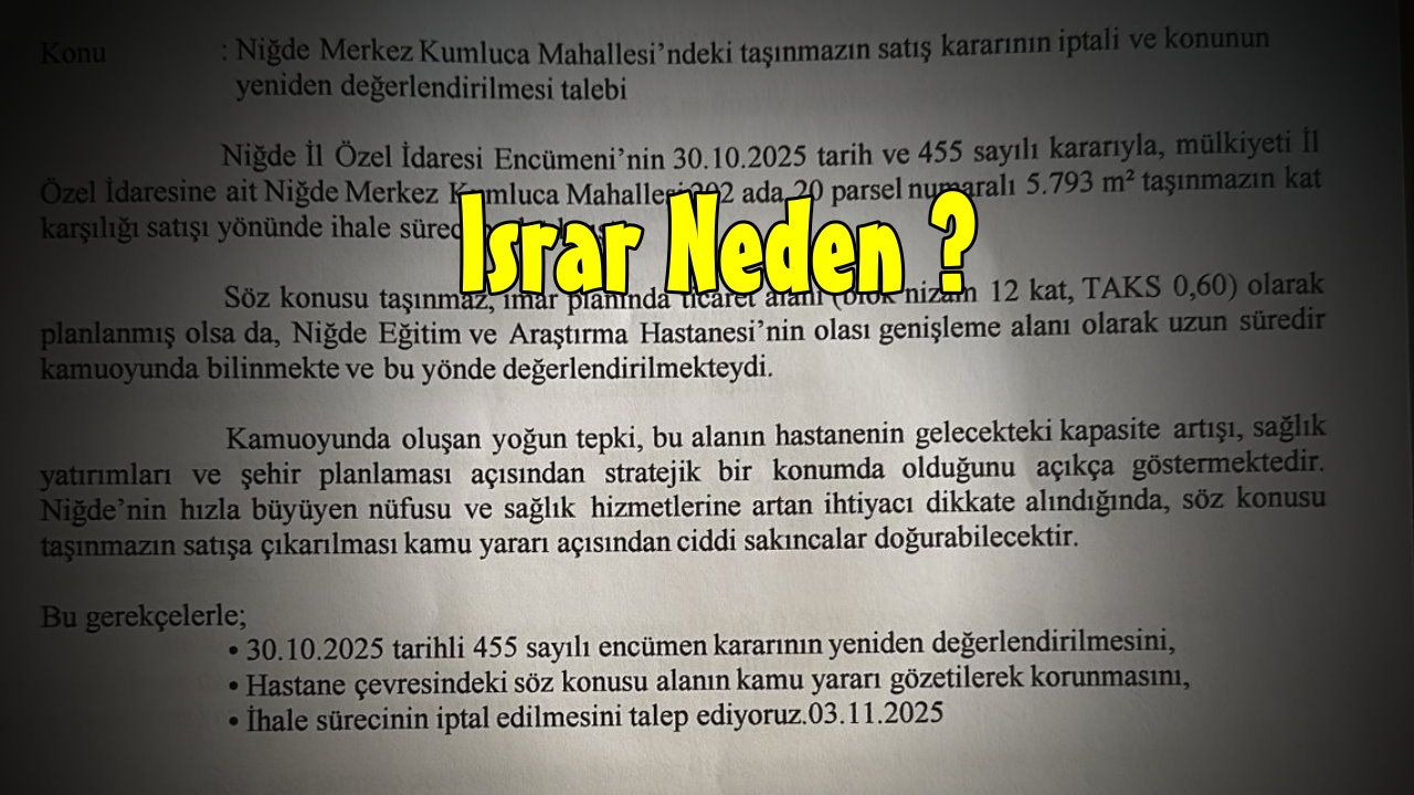 CHP’li Meclis Üyeleri kamuoyunda tepkiye sebep olan bu arsanın satışının tekrar değerlendirilmesi, kamu yararı göz önüne alınarak satışın iptal edilmesi için Niğde İl Genel Meclis Başkanlığına soru önergesi verdi.