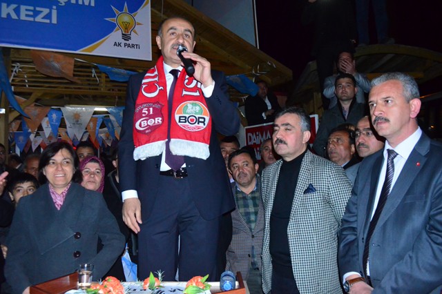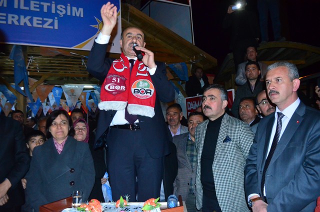 Bizim hedefimiz belli, Başbakanımız ne diyor, hedef 2023 diyor. Bizimde Bor’da hedefimiz 2023 ve daha da ötesi olacak. Burada ayrılık gayrılık yok. Biz bu filmi 80 öncesinde seyrettik. Kızılcalı, Kemerhisarlı Bor’a gelemiyordu. Biz Niğde’ye gidemiyorduk, Kemerhisar’a gidemiyorduk. Ama döndük baktık ne varmış aramızda, Kemerhisarlı ile, Kızılcalı ile, Çukurkuyu ile kardeşliğimiz varmış. Ama bize sol – sağ dediler bunu yutturdular. İşte bundan dolayı kesinlikle bölünmeyeceğiz. Kesinlikle bizi tekrar bölmelerine izin vermeyeceğiz.