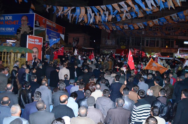 Seçim bürosu önünde kalabalık bir topluluğa hitap eden Başkan Erat, konuşması sırasında aynı anda bir salonda konuşma yapmak üzere Bor İlçesine gelen Sağlık Eski Bakanı Osman Durmuş’un bakanlığı sırasında Bor Fizik Tedavi Hastanesi inşaatını ziyareti sırasında söyledikleri sözler geceye damgasını vurdu.