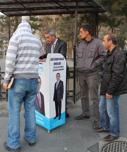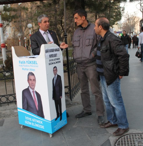 Aşağı Kayabaşı Mahallesinin farklı olduğunu ve böyle bir mahalleye de farklı bir muhtar gerektiğini söyleyen muhtar adayı Fatih Yüksel, mahallesinde işlek bölgelerde kürsü kurarak etrafına topladığı mahalle sakinlerine kürsüyü teslim ederek onları dinliyor.