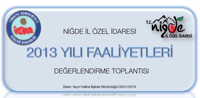 Niğde İl Özel İdaresi 2013 yılı faaliyetleri değerlendirme toplantısı yaptı. Niğde İl Genel Meclis Salonunda yapılan toplantıya Niğde İl Genel Meclis Üyeleri, Niğde İl Özel İdare Müdürlüğü yöneticileri katıldı. 2013 yılı faaliyetlerinin değerlendirildiği basın toplantısında sunumu Niğde İl Özel İdare Genel Sekreteri Ali Nebol yaptı. Genel Sekreter Ali Nebol, 2013 yılı faaliyetlerini slayt sunumu ile anlattığı toplantıda ilk olarak Niğde Özel İdaresinin yapısı hakkında bilgi verdi. Özel İdarenin görevlerini anlatan Nebol, bu görevleri 97 memur, 185 işçi olmak üzere toplan 282 personel ile hizmet sunduklarını belirtti.
