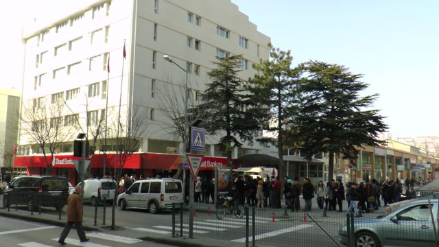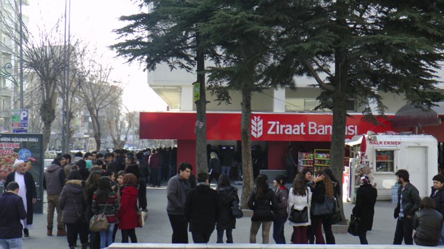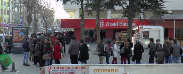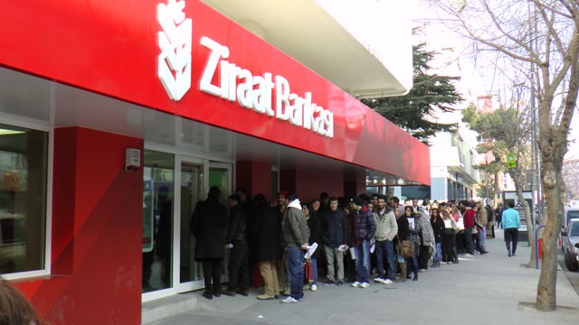 Gençlik Ve Spor Bakanlığı Yüksek Öğrenim Kredi ve Yurtlar Kurumu Genel Müdürlüğü'nden 2013'te üniversiteye kayıt yaptırarak burs ve öğrenim kredisi almaya hak kazanan öğrenciler, banka kartları için yapılacak başvuru için Ziraat Bankası önünde uzun kuyruklar oluşturdu.